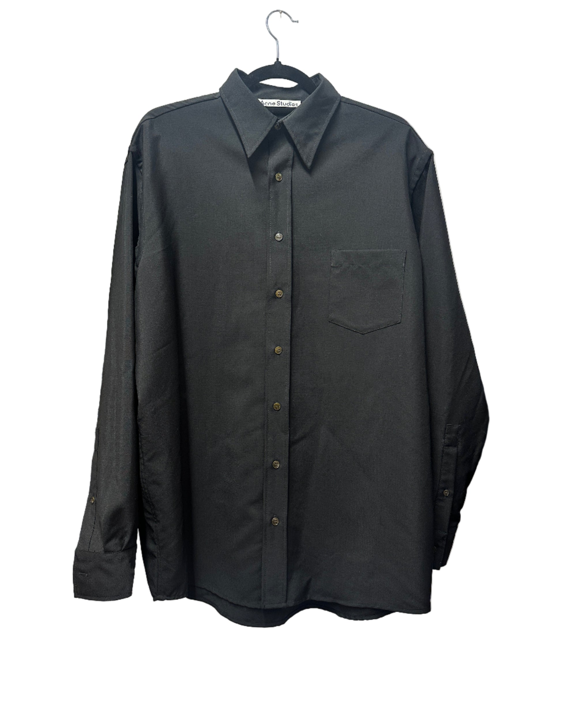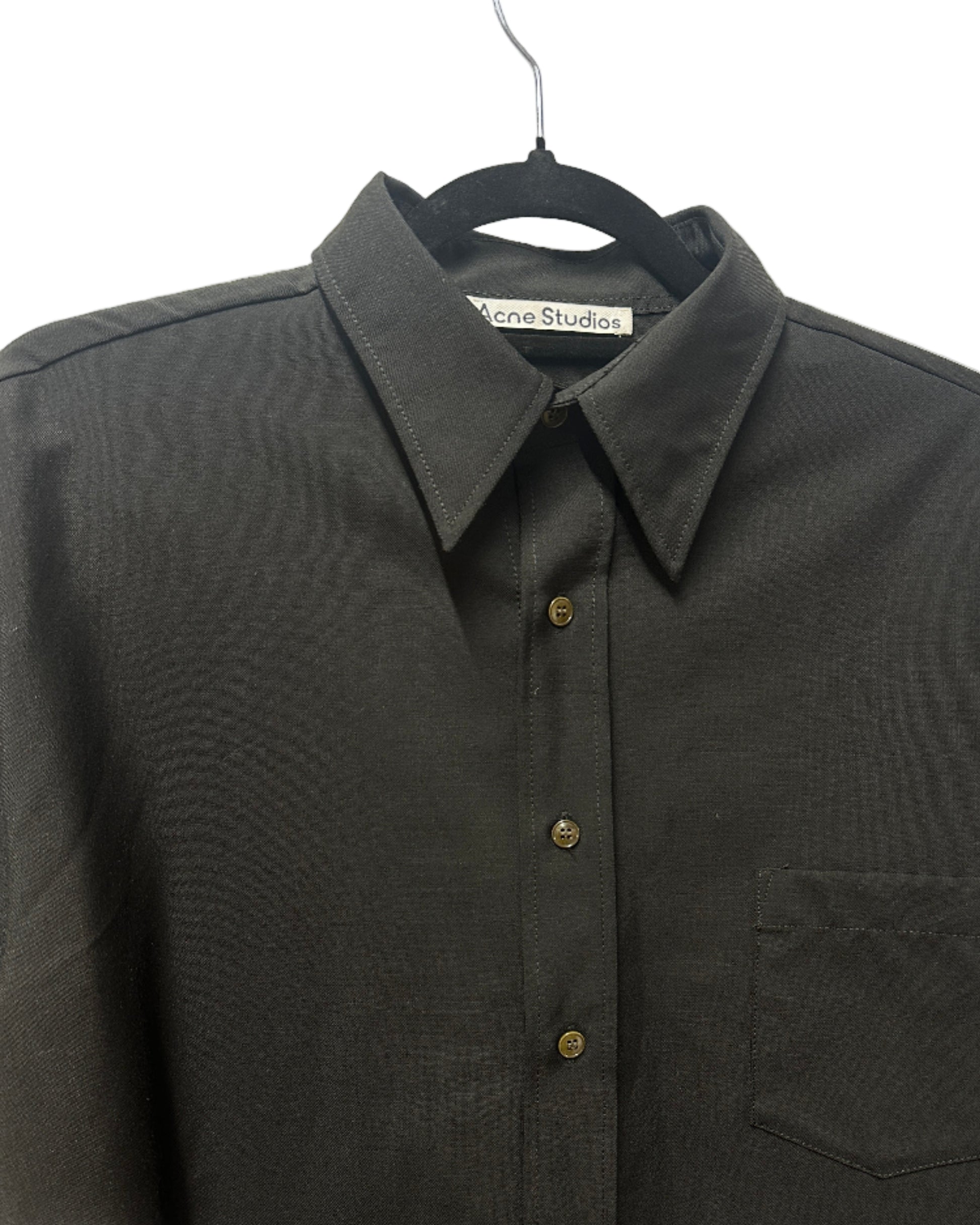 Features: Antique Studios Embroidery on back collar, Brown buttons and chest pocket. Oversized fit with buttoned cuffs.