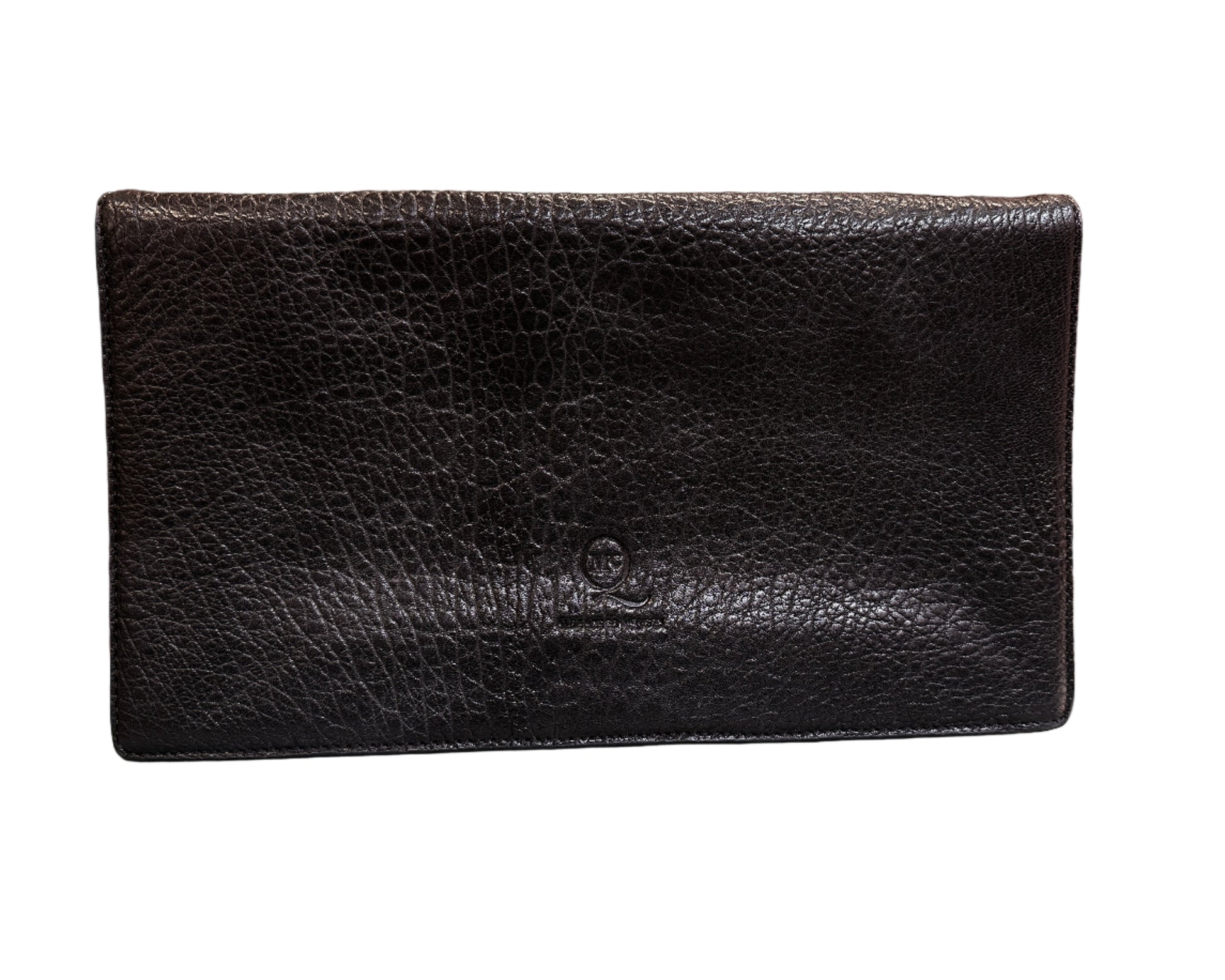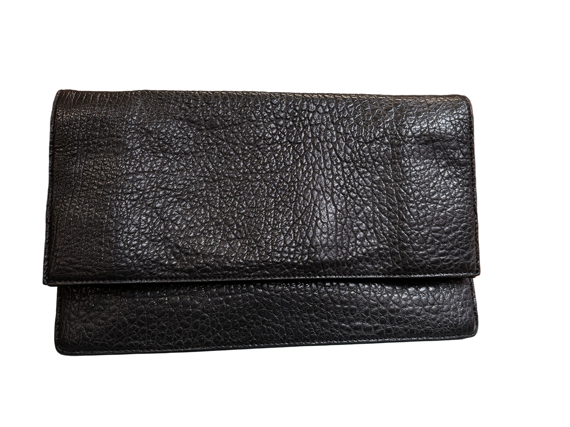 Features: Pebbled leather flap clutch with subtle branding, large style with fold out style and internal zip pocket. Hidden magnetic clasp.