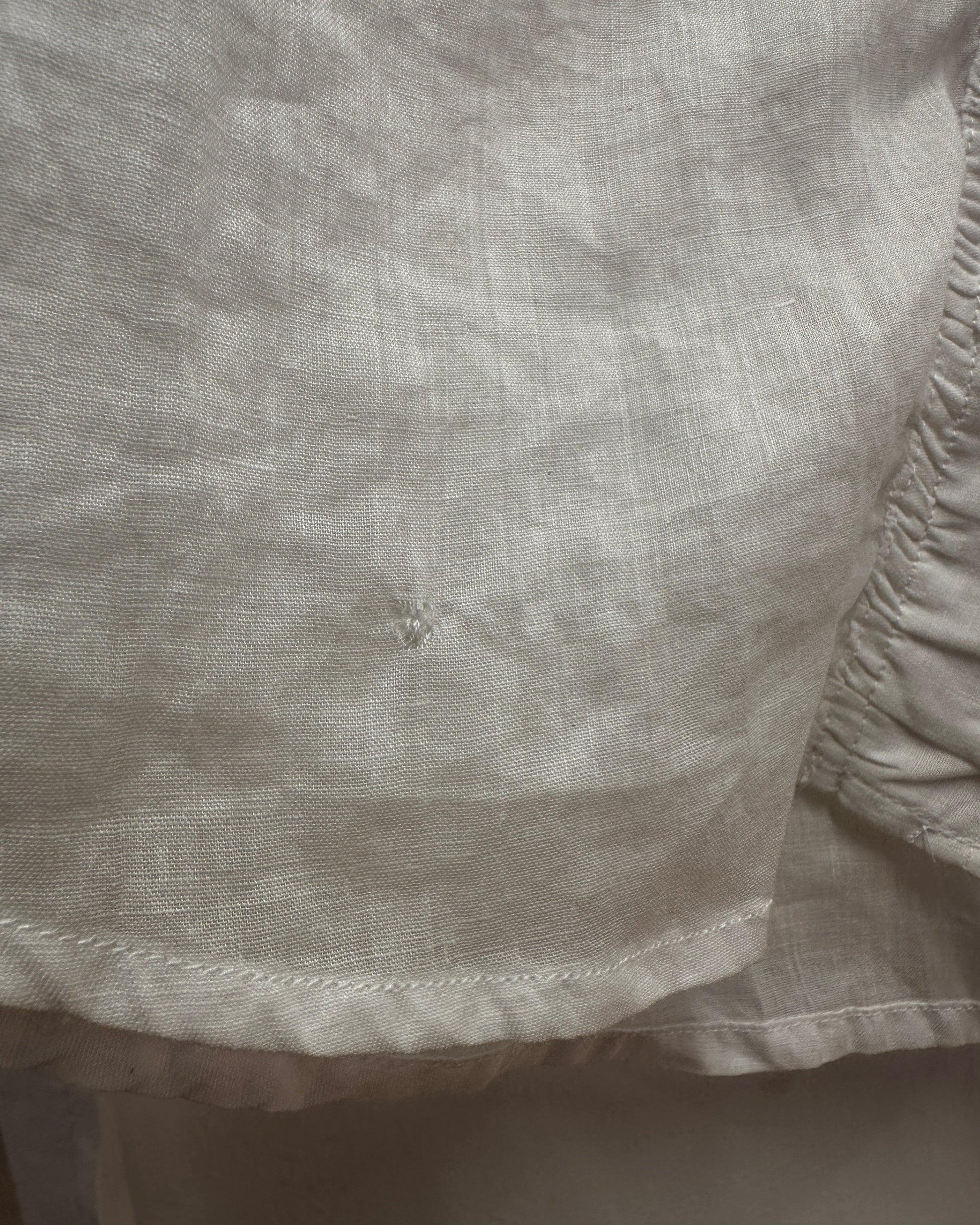 Features: Frill detail along full button up length, frill on capped style shoulders. Removable matching white cotton belt.
