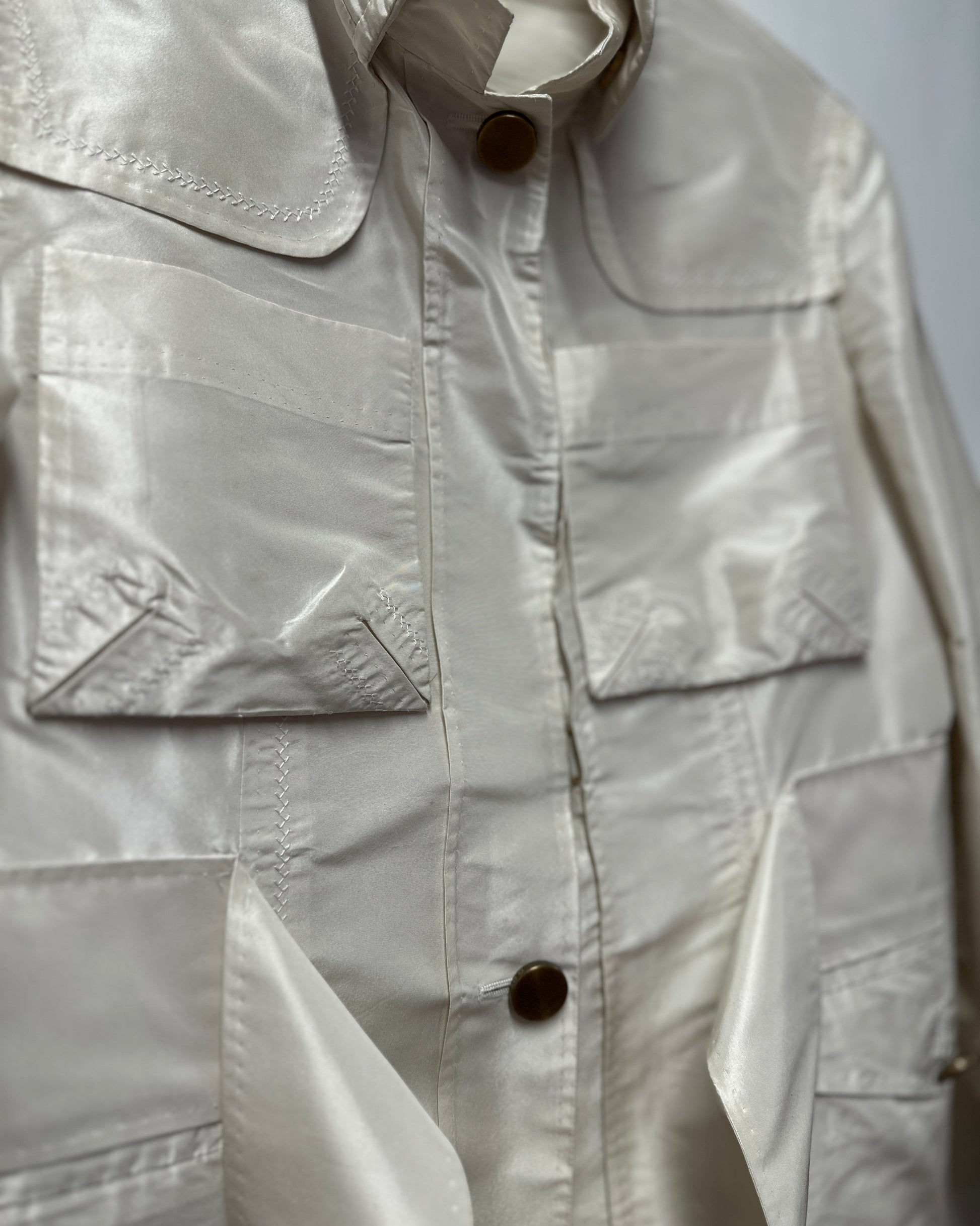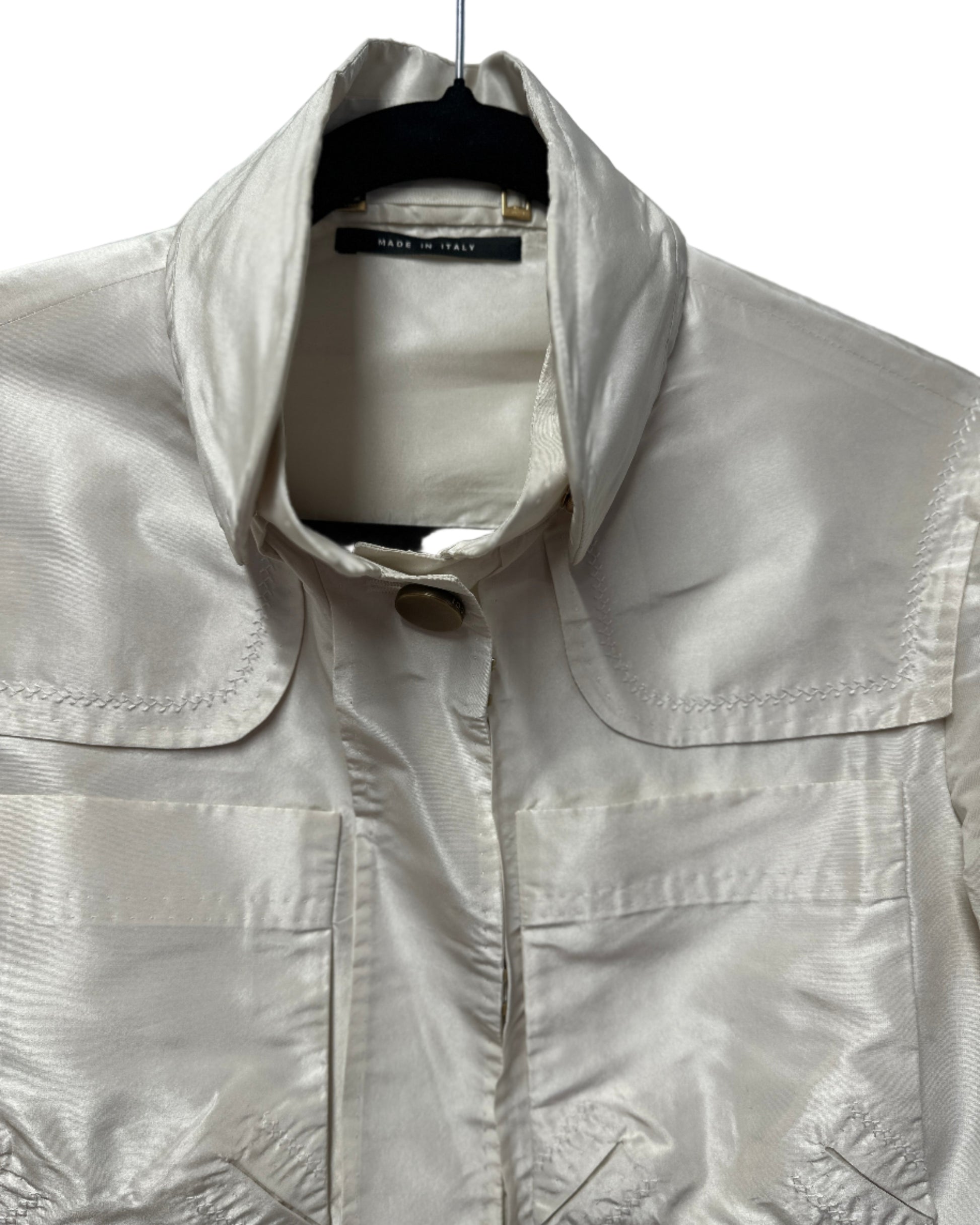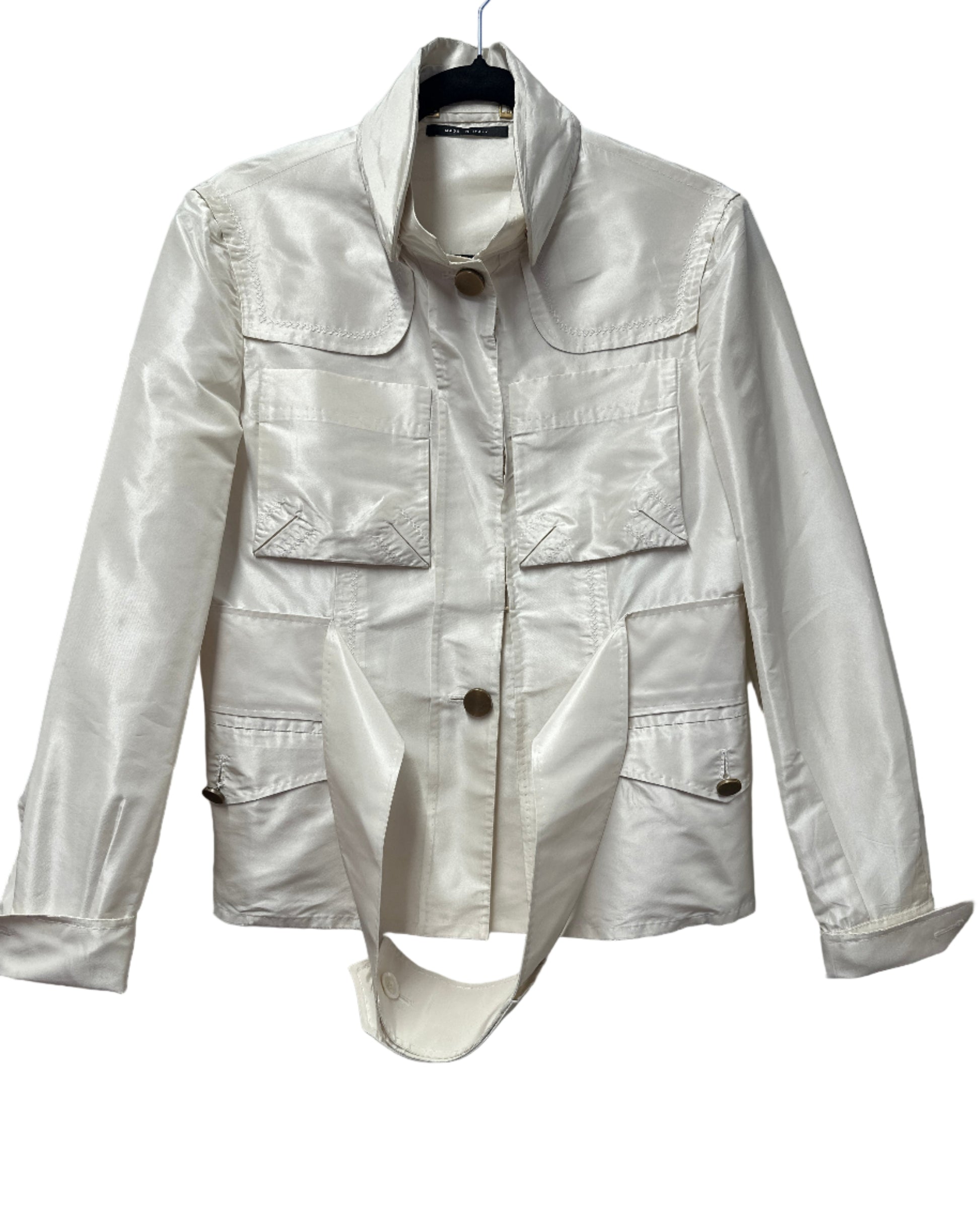 Features: Matching stitched gucci detail belt, utility style jacket, with gold coloured hardware and matching buttons.