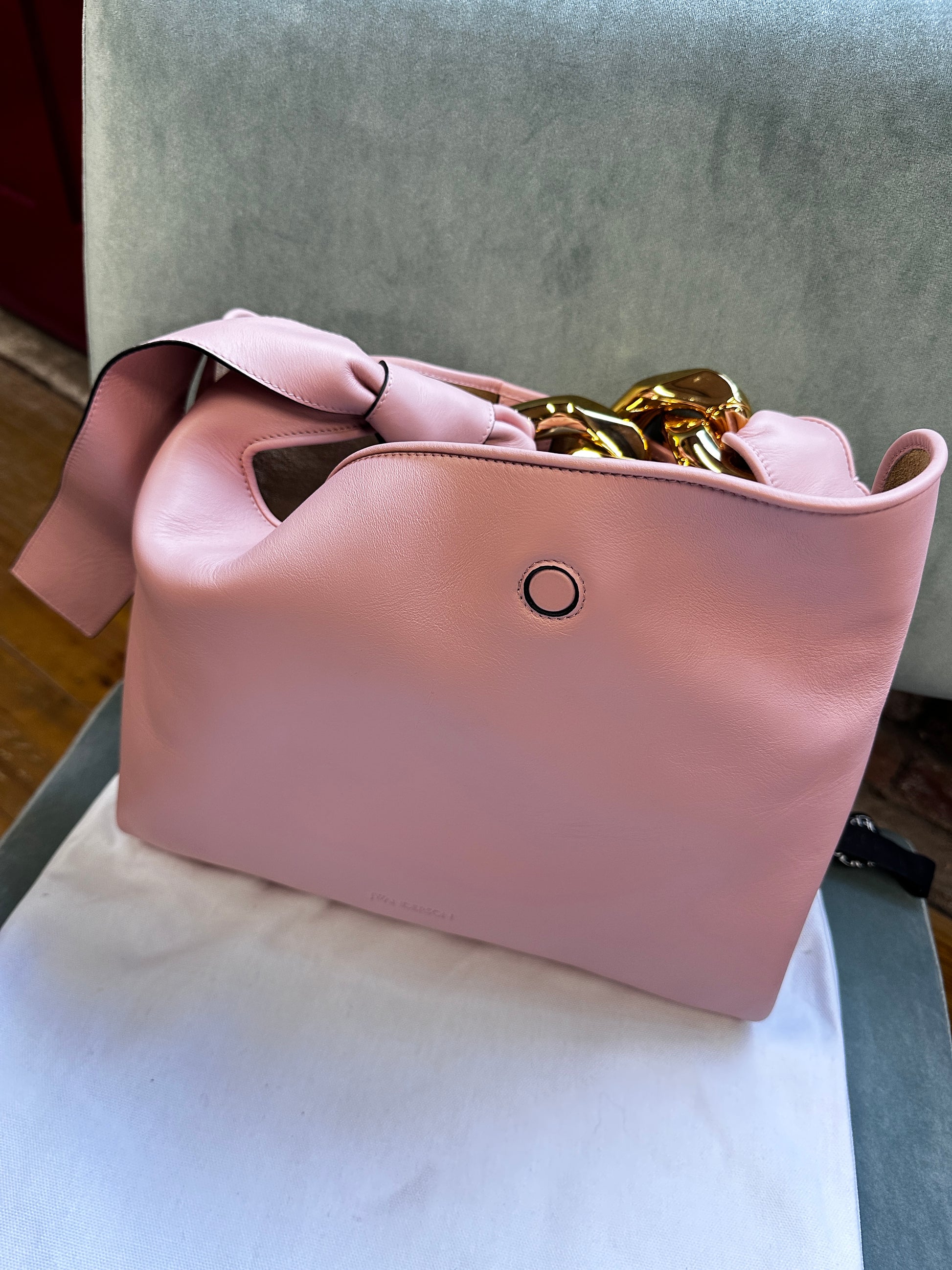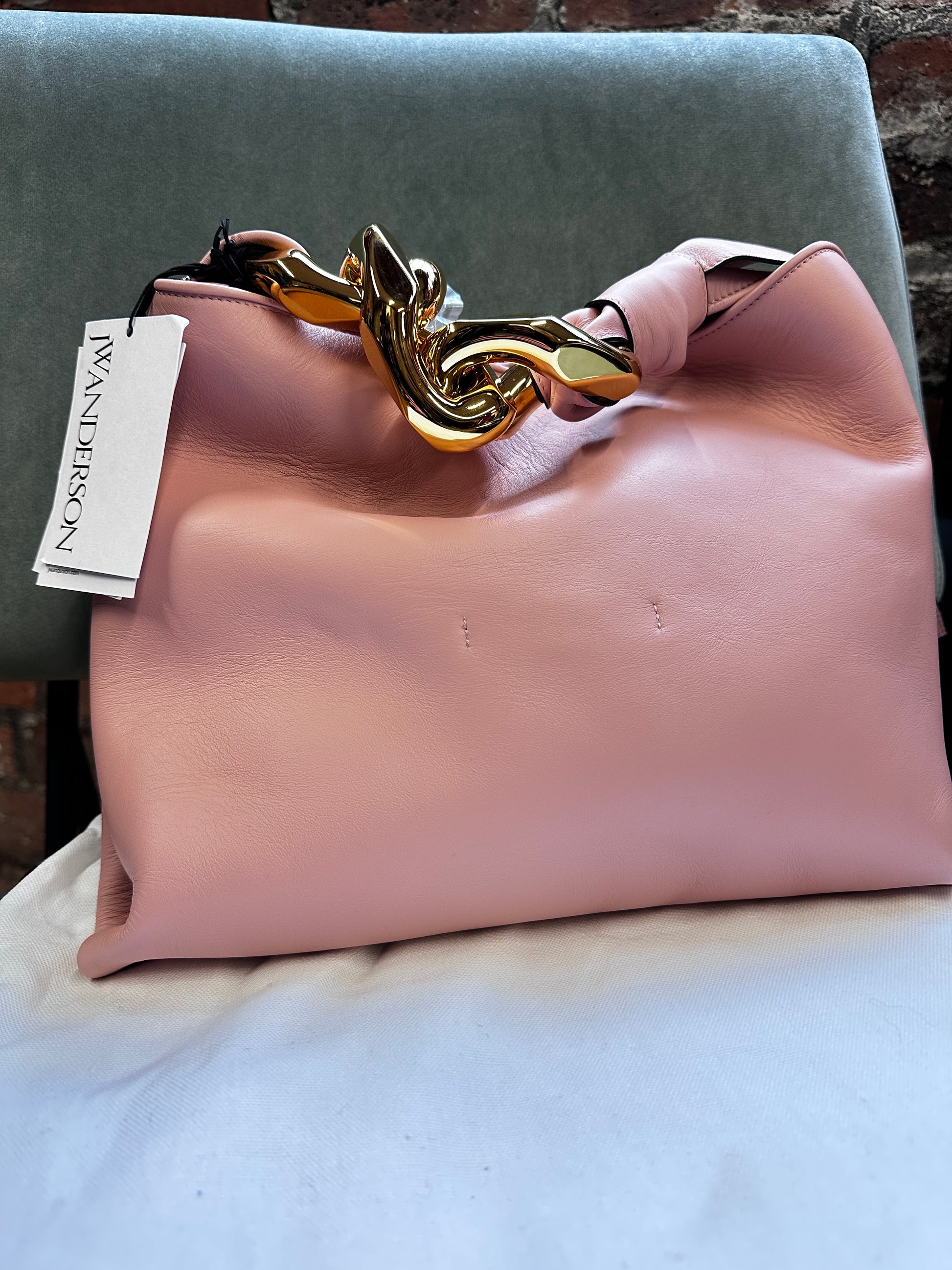 Features: Medium handbag, super soft leather, and internal pocket. Gold coloured lightweight plastic chain detail and stitched in matching leather tie.