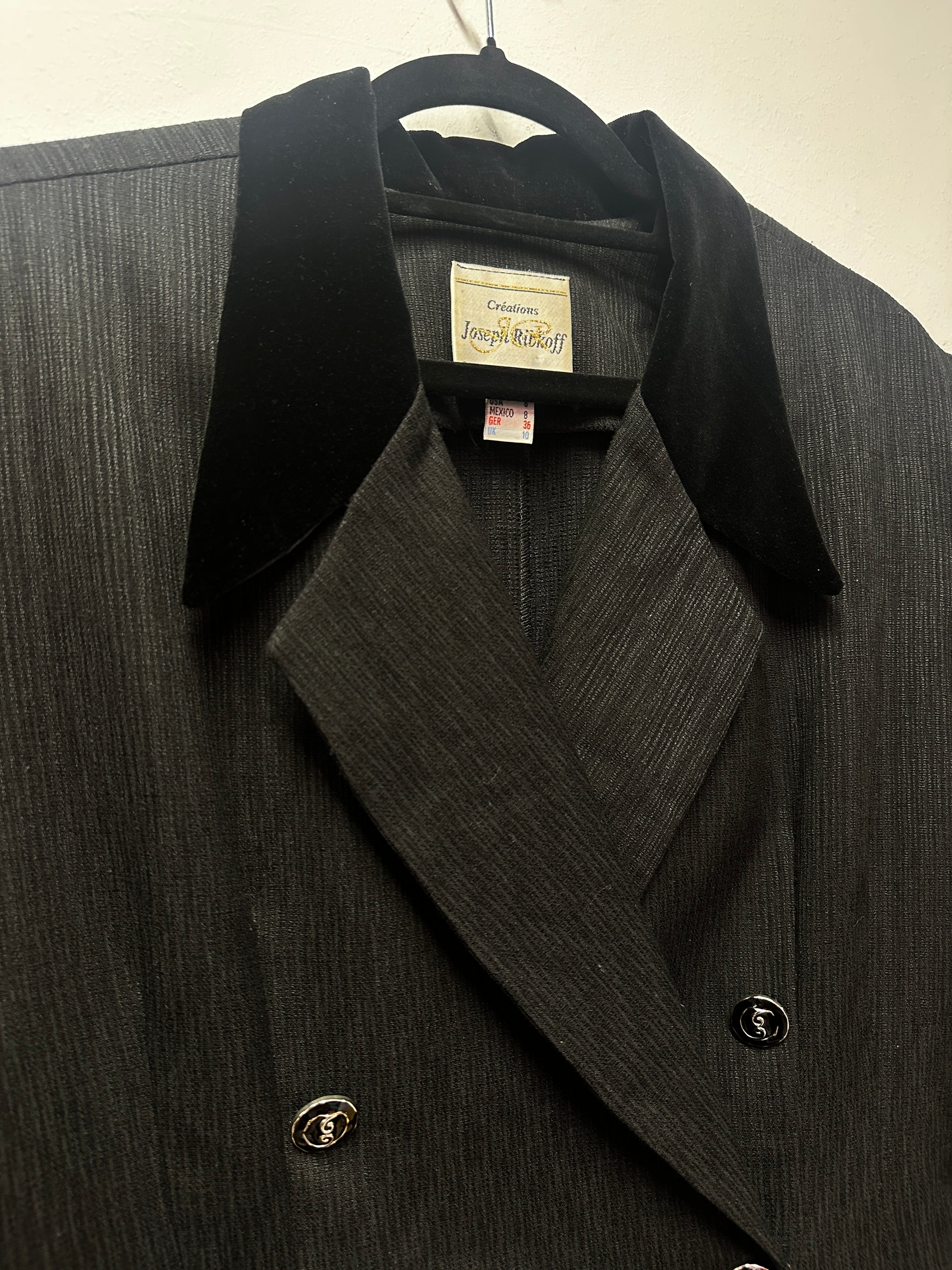 Features: Blazer dress with double breast buttons, large velvet collar detail in black and knee length. Beautifully tailored piece, perfect for an evening out or formal work environment. There are shoulder pads to keep the large construction of the piece.