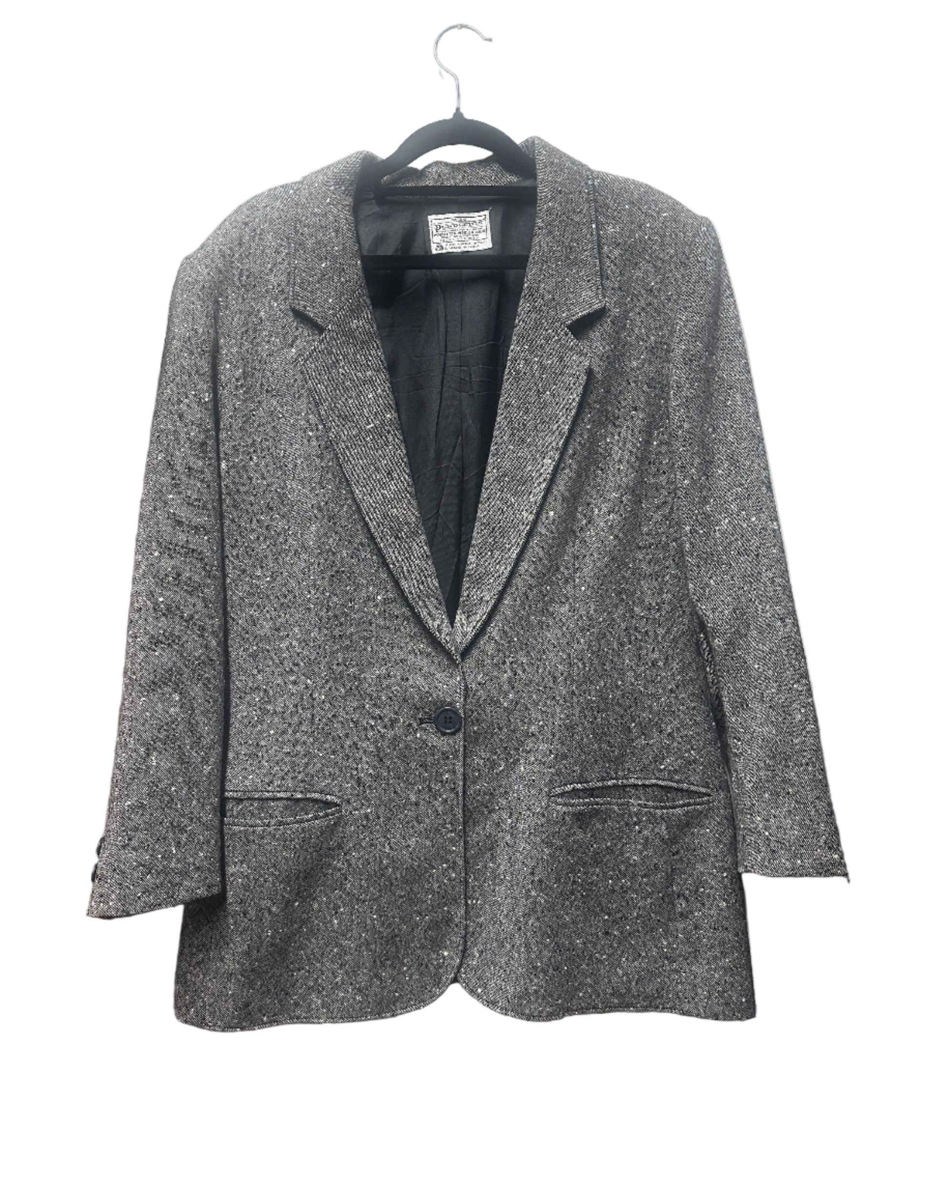 Details: Wool blazer style jacket, Internal fabric polyester lining. Gorgeous speckle grey and white jacket. Perfect for formal occasions. Front usable pockets. 1 Grey button.